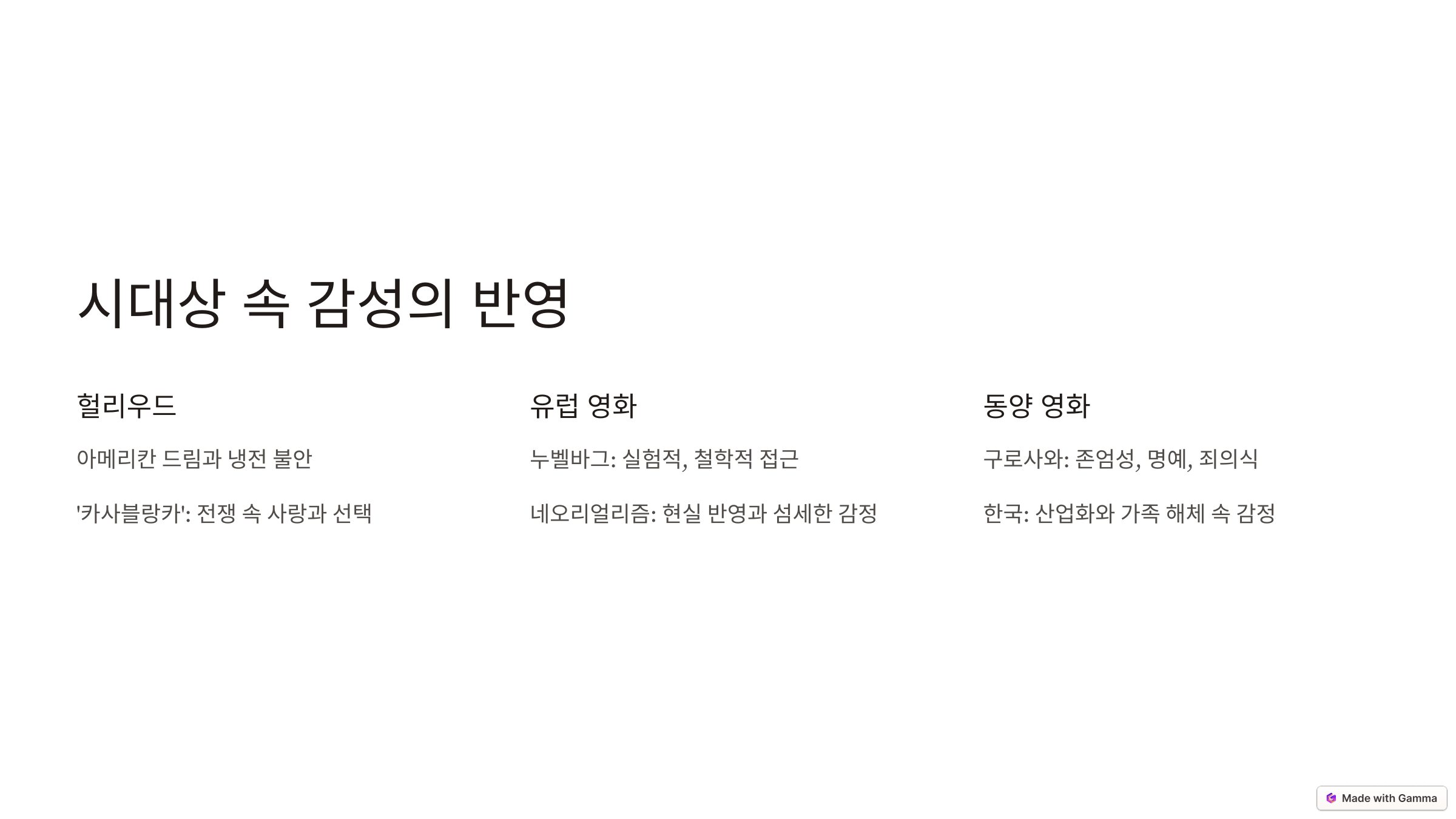 각 시대의 고전영화는 그 시기 사람들의 감성적 코드와 정서를 담고 있습니다. 예컨대 1950년대 헐리우드 영화는 아메리칸드림과 가족주의의 환상을 심어주는 동시에, 냉전과 사회 불안 속에서 불안한 감성을 스며들게 했습니다. '카사블랑카' 같은 영화는 전쟁 속의 사랑과 선택이라는 고전적 주제를 다루며 시대의 딜레마를 감성적으로 표현합니다. 유럽 영화는 특히 감성표현에 있어서 실험적이면서도 철학적인 접근을 했습니다. 프랑스 누벨바그 영화나 이탈리아 네오리얼리즘 영화는 현실을 있는 그대로 반영하면서도, 그 속의 감정을 아주 섬세하게 그려냈습니다. 빔 벤더스나 페데리코 펠리니의 영화는 관객에게 감정적 몰입보다는 감정의 여운과 질문을 남기는 방식으로, 감성의 다양성을 확장시키는 역할을 했습니다. 동양의 고전영화들도 마찬가지입니다. 일본의 구로사와 아키라 감독 작품은 인간의 존엄성과 명예, 죄의식 등을 깊은 감성으로 다루었고, 한국의 1960~70년대 영화는 산업화와 가족 해체 속에서의 인간의 감정을 절절하게 그려냈습니다. 이런 다양한 시대상 속에서, 고전영화는 감성을 단순한 기분이 아니라 역사적이고 문화적인 흐름 속의 일부로 형상화합니다.